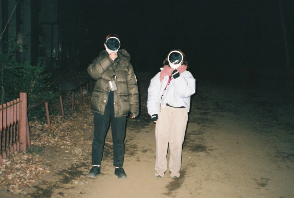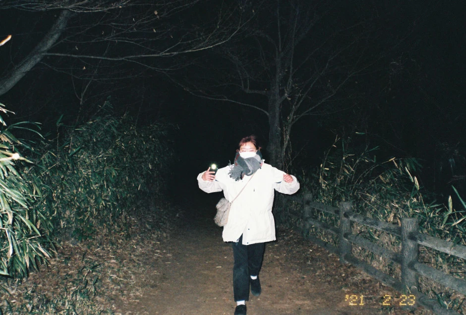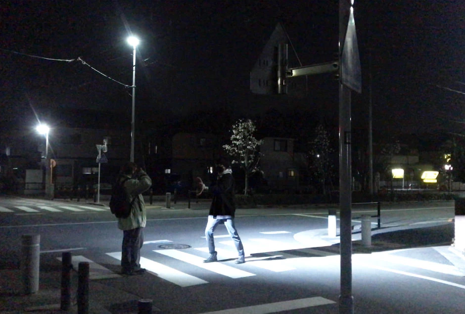 ここには、夜の本当の暗さが写されている。夜の道を歩く時、懐中電灯と家々の光がぽつりぽつりと入り込む以外は闇だ。わたしもかつて、同じ美大に通う学生だったからわかるのだけれど、あの上水路の道は本当に暗い。青い電灯がところどころついているけど微かな光で、足元によく目を凝らさないと枝や根につまずきそうになる。